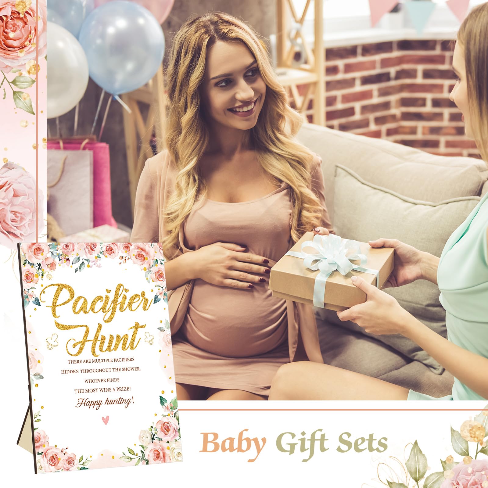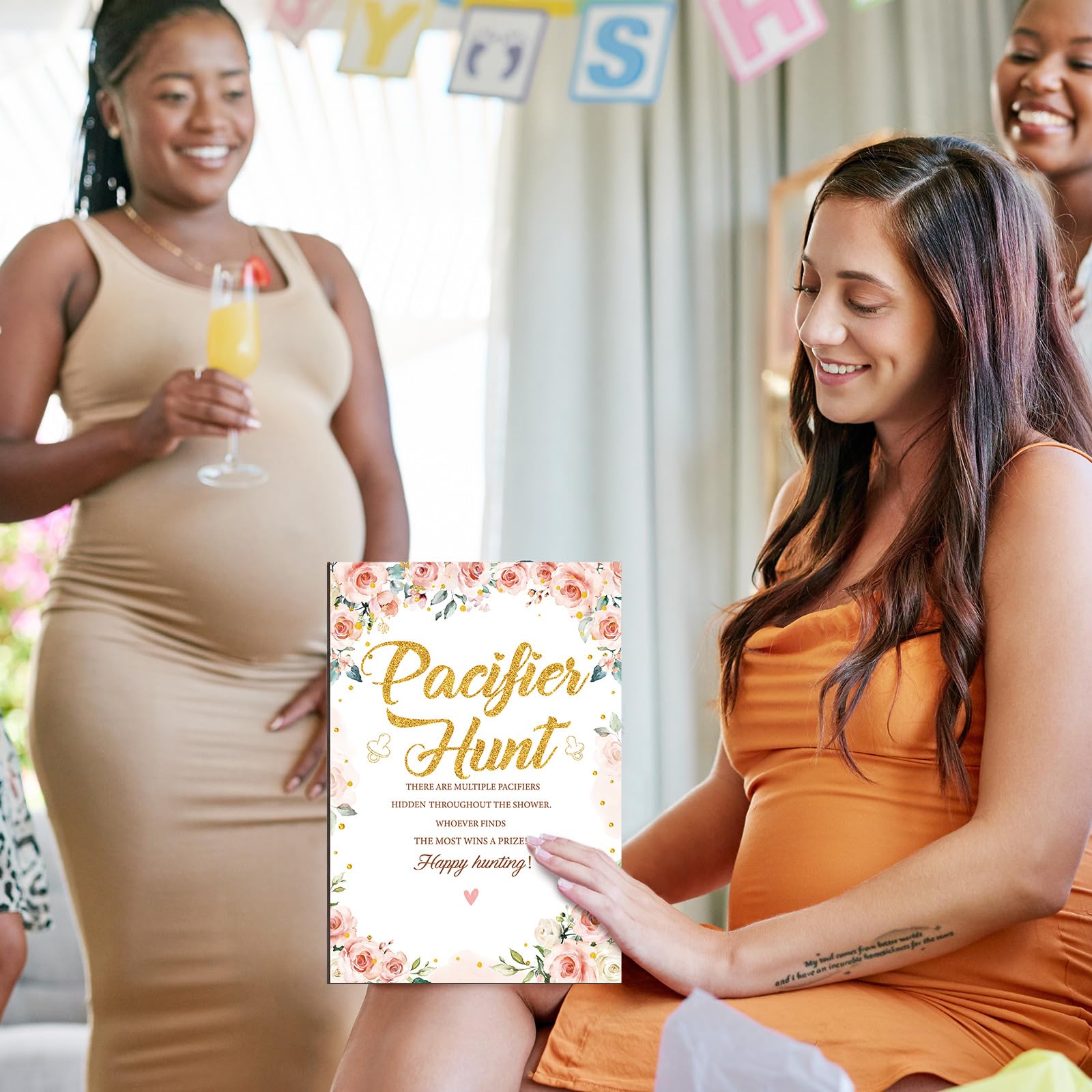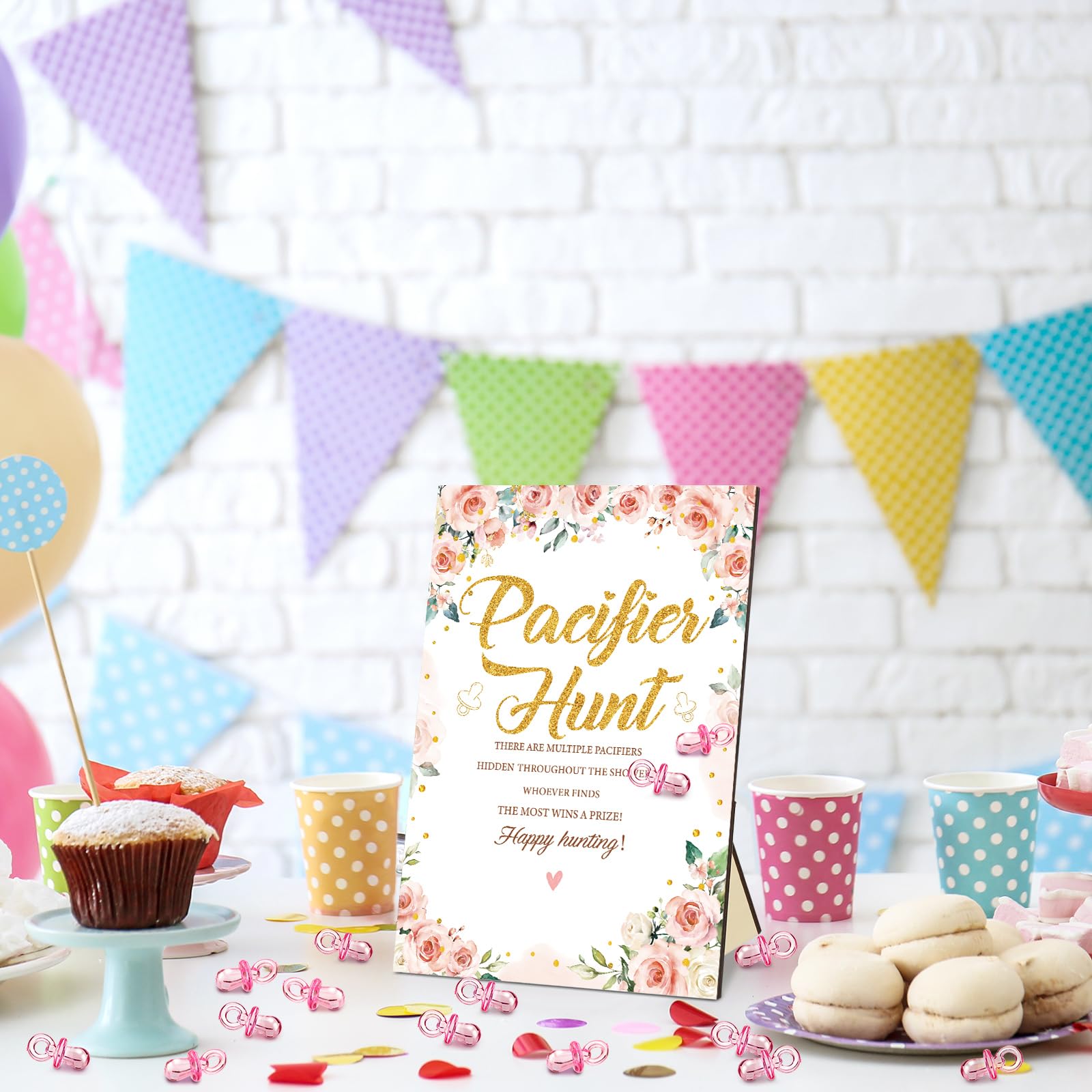 Thyle 51 Pcs Pacifier Hunt Baby Shower Games Include Hunt Sign and 50 Acrylic Pacifiers for Baby Shower Game Decoration Gift Sets Gender Reveal Party Decor(Flower)