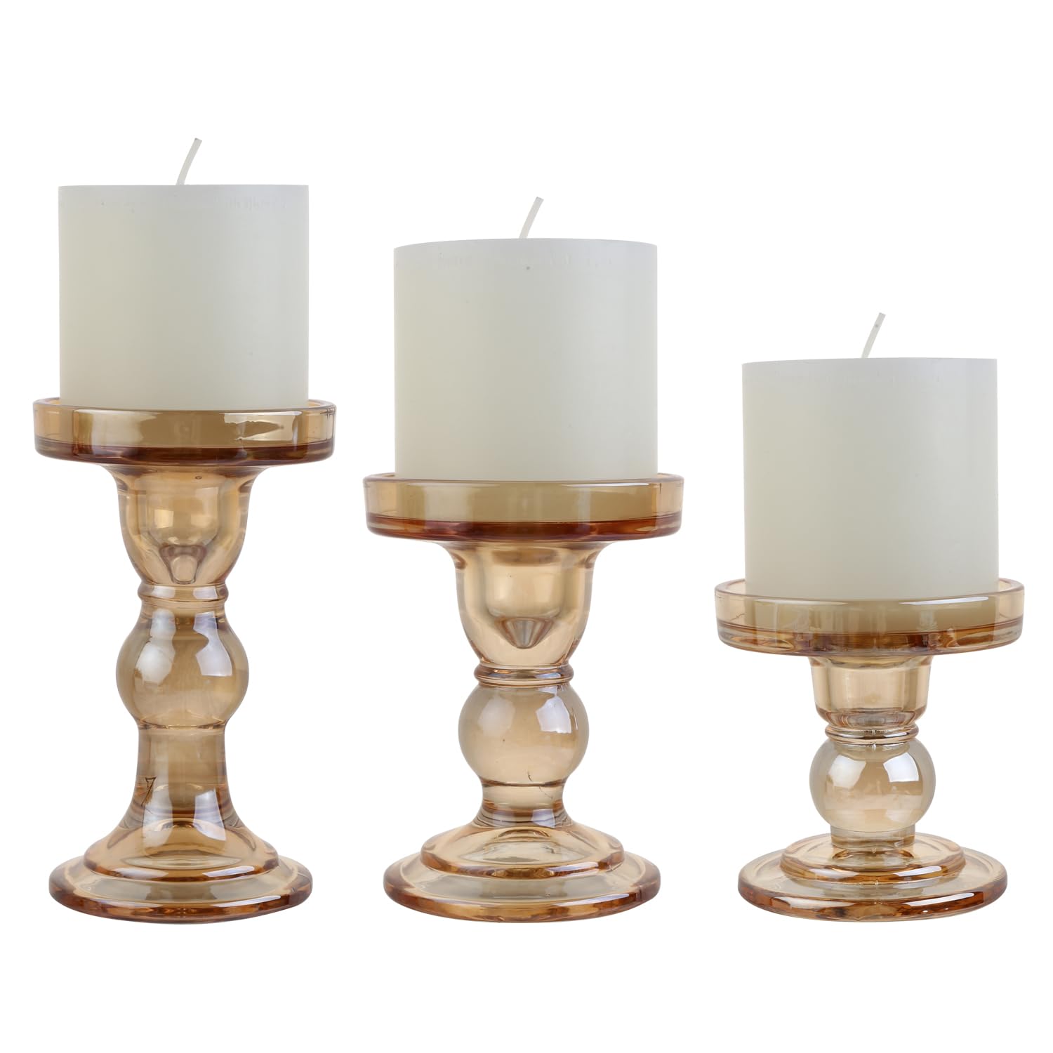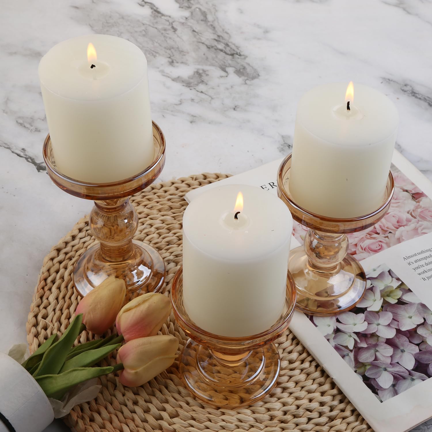 BTGLLAS 3-Piece Set of Amber Glass Candlestick, Crystal Candlestick Holder Holder and Conical Candle, Christmas Candle Holder Decoration, Family Living Room Wedding Candle Holder (Amber)