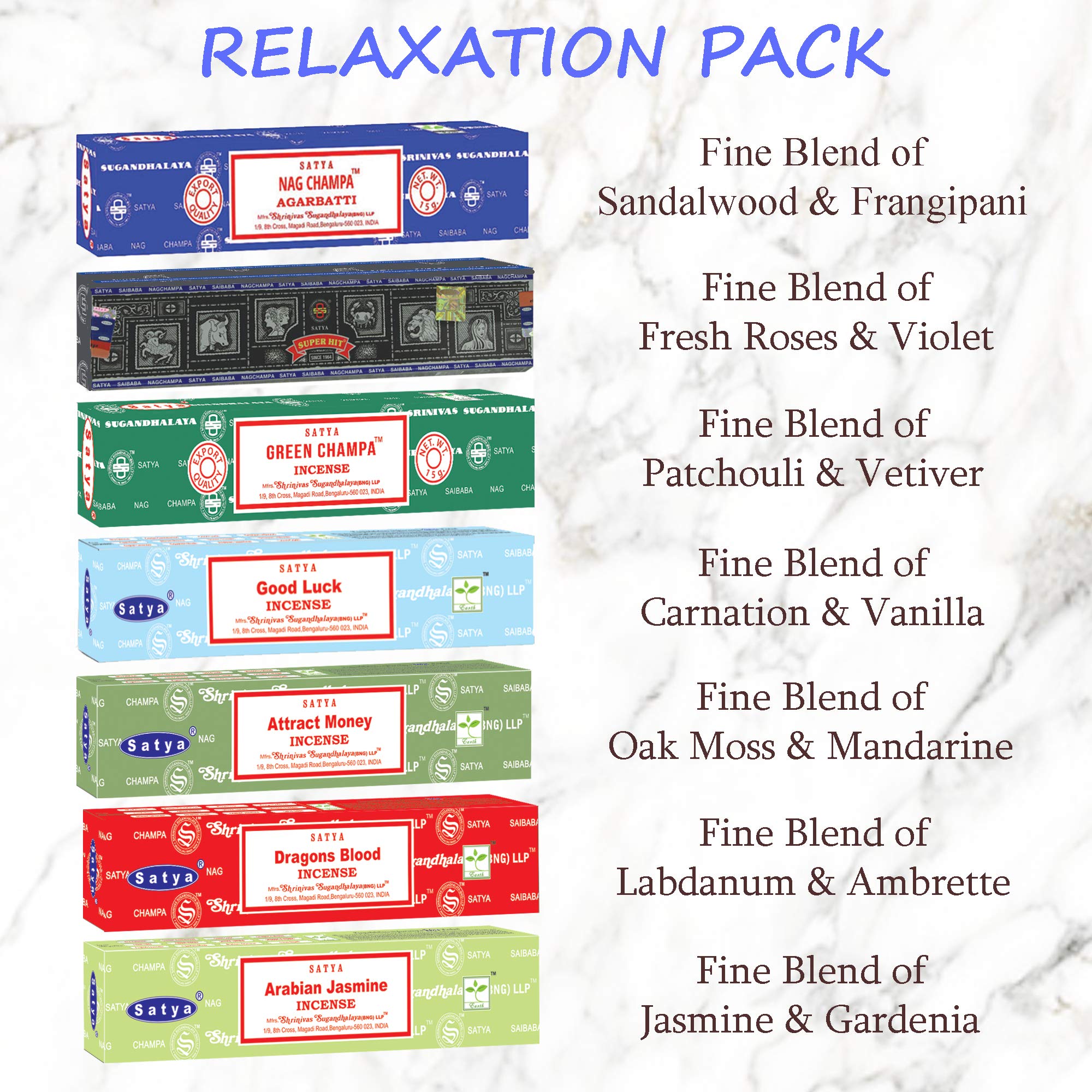Satya Incense Sticks Gift Set, 7 Scents, Nag Champa, Super Hit, Dragon’s Blood, Sandalwood, Patchouli, Lavender, Positive Vibes, 15g Each (Relaxation Mix)