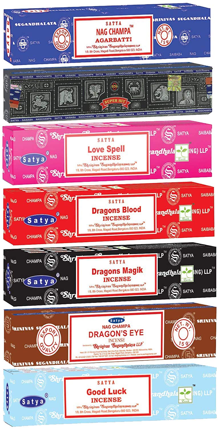 Satya Incense Sticks Gift Set, 7 Scents, Nag Champa, Super Hit, Dragon's Blood, Sandalwood, Patchouli, Lavender, Positive Vibes, 15g Each (Magic Mix)Satya Incense Sticks Gift Set, 7 Scents, Nag Champa, Super Hit, Dragon’s Blood, Sandalwood, Patchouli, Lavender, Positive Vibes, 15g Each (Magic Mix)