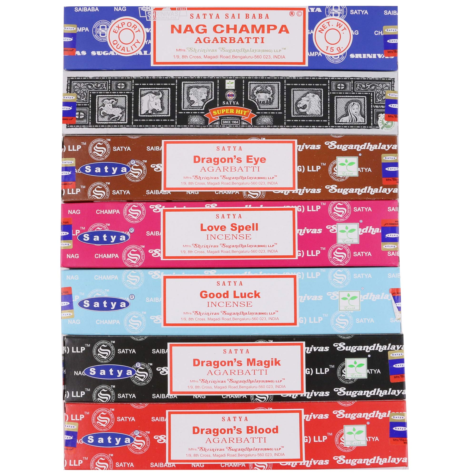 Satya Incense Sticks Gift Set, 7 Scents, Nag Champa, Super Hit, Dragon’s Blood, Sandalwood, Patchouli, Lavender, Positive Vibes, 15g Each (Magic Mix)