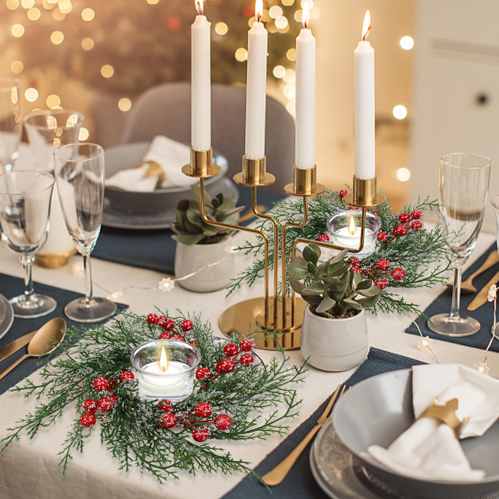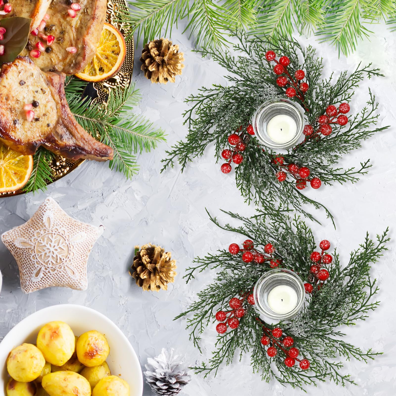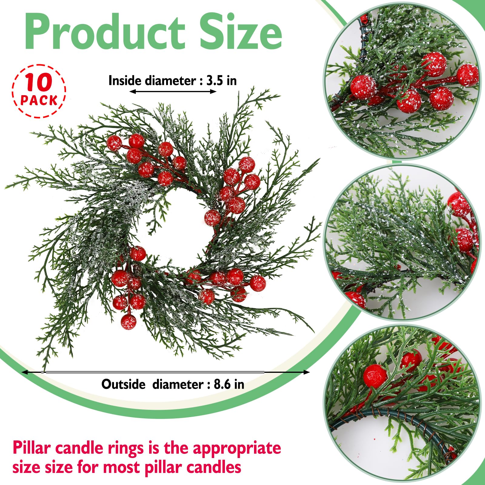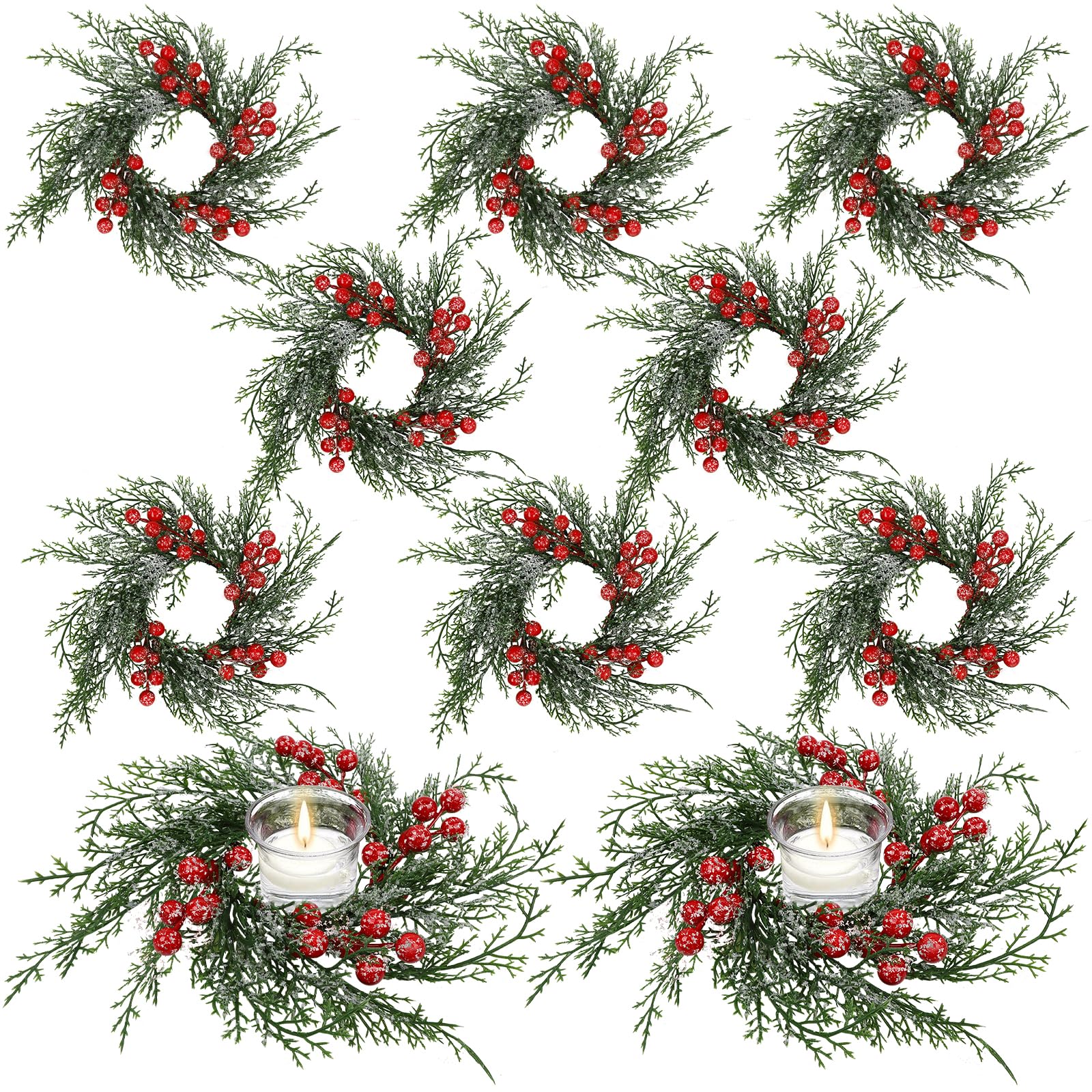 Serlvan 10 Pcs Christmas Candle Rings Wreath Artificial Candle Rings with Red Berry, Snowy Pine Garland Candle Ring Holder for Christmas Decorations Table Centerpiece