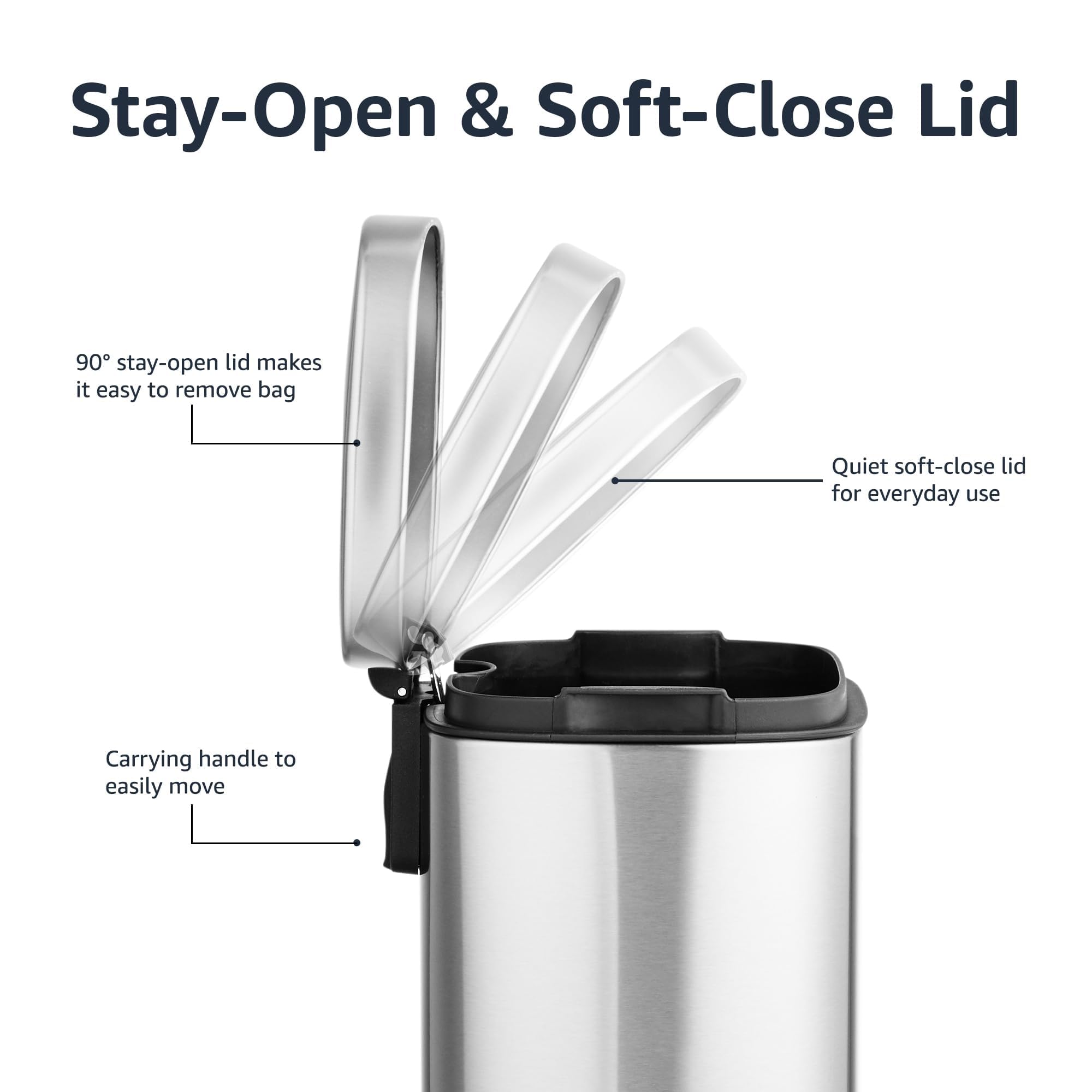 Amazon Basics Smudge Resistant Mini Rectangular Trash Can With Soft-Close Foot Pedal, Brushed Stainless Steel, for Bathroom & small space, 5 L /1.32 Gal, Satin Nickel Finish, 7.3x8.5 x11.8 in (LxWxH)Amazon Basics Smudge Resistant Mini Rectangular Trash Can With Soft-Close Foot Pedal, Brushed Stainless Steel, for Bathroom & small space, 5 L /1.32 Gal, Satin Nickel Finish, 7.3×8.5 x11.8 in (LxWxH)
