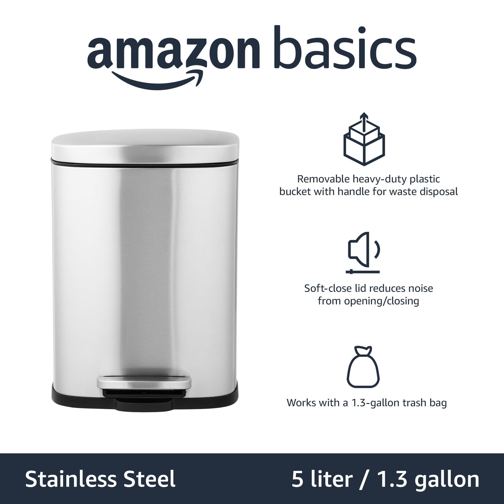 Amazon Basics 5 Liter / 1.3 Gallon Small Bathroom Soft-Close, Smudge Resistant Trash Can with Foot Pedal – Brushed Stainless Steel, Satin Nickel Finish