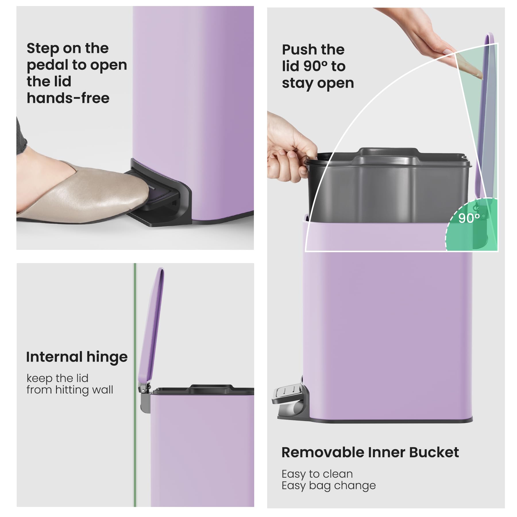 Cesun Small Bathroom Trash Can with Lid Soft Close, Step Pedal, 6 Liter / 1.6 Gallon Stainless Steel Garbage Can with Removable Inner Bucket, Anti-Fingerprint Finish (Purple)Cesun Small Bathroom Trash Can with Lid Soft Close, Step Pedal, 6 Liter / 1.6 Gallon Stainless Steel Garbage Can with Removable Inner Bucket, Anti-Fingerprint Finish (Purple)